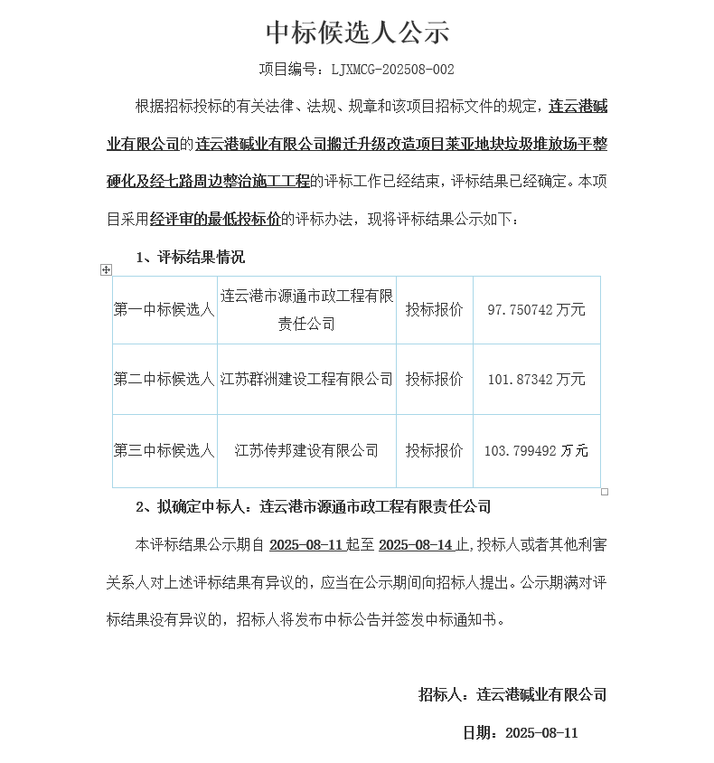 搬遷升級改造項目萊亞地塊垃圾堆放場平整硬化及經(jīng)七路周邊整治施工工程中標候選人公示