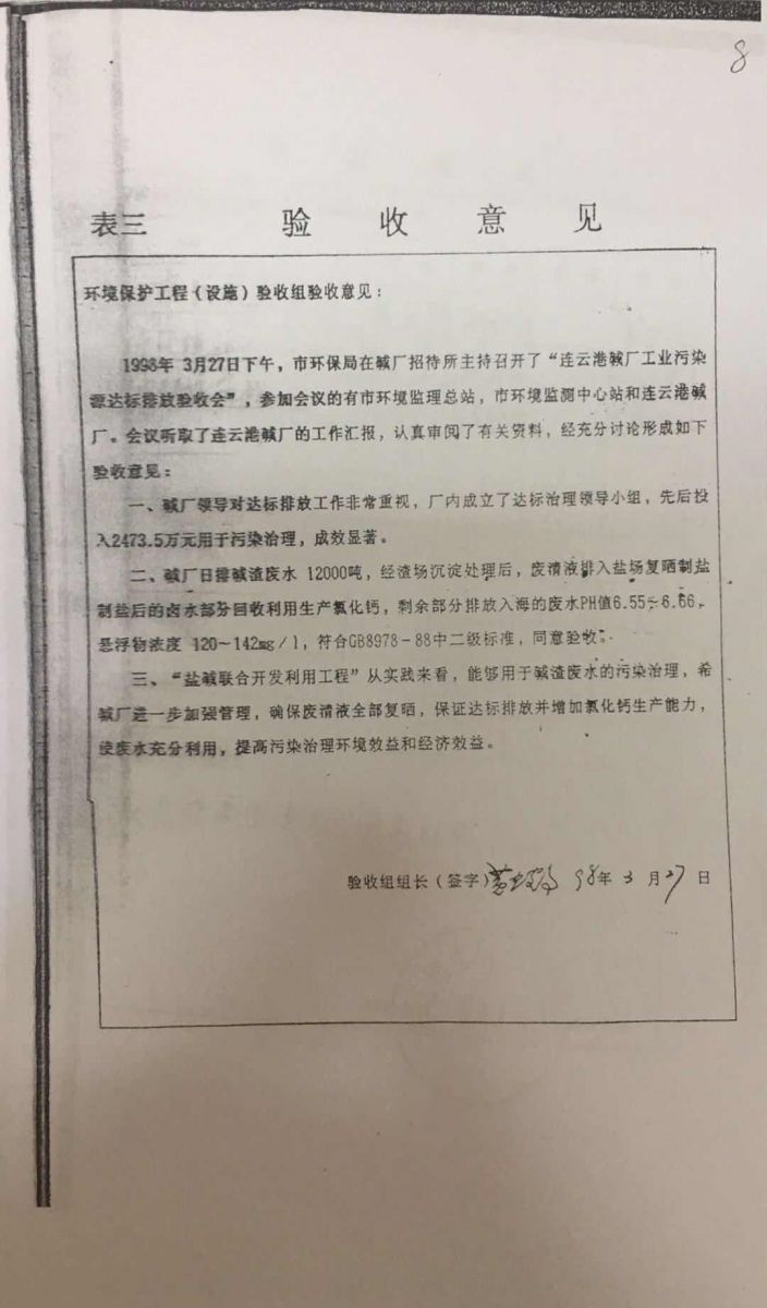 根據(jù)吉林化學(xué)工業(yè)公司設(shè)計(jì)院《連云港堿廠環(huán)境影響報(bào)告書》和原江蘇省環(huán)境保護(hù)局《關(guān)于對連云港堿廠環(huán)境影響報(bào)告書的批復(fù)》(蘇環(huán)管〔86〕31號)的要求,連云港堿廠產(chǎn)生的廢液送至渣場,經(jīng)澄清后,上清液經(jīng)自有排口閘直接排海。1997年,根據(jù)淮河流域水污染防治的要求,連云港市環(huán)保局向連云港堿廠下達(dá)了《關(guān)于淮河流域水污染源限期達(dá)標(biāo)排放的決定》(連環(huán)管〔1997〕16號)。據(jù)此,連云港堿廠與臺(tái)北鹽場合作開發(fā)了“堿渣場上清液回收利用工程”項(xiàng)目,利用上清液制鹽、制鈣。1998年3月27日,該項(xiàng)目通過連云港市環(huán)保局組織的環(huán)保驗(yàn)收,正式運(yùn)行。