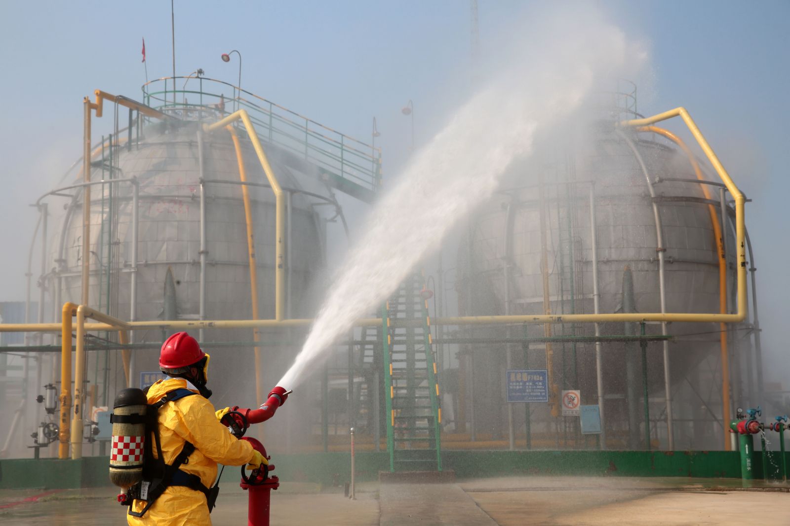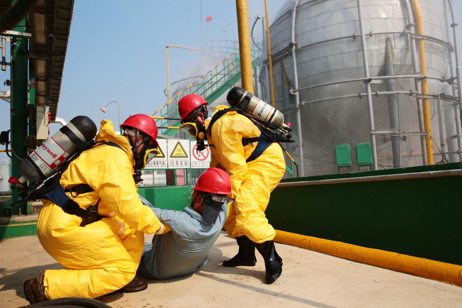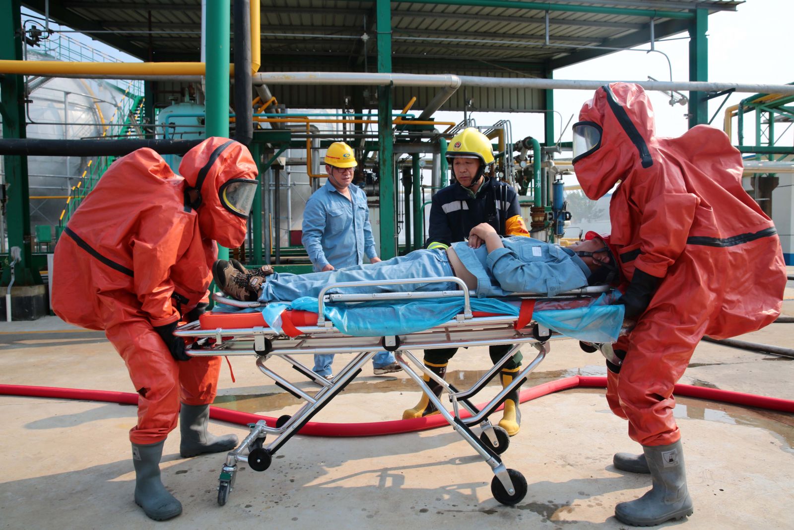 為檢驗公司應急救援時各環節的協調能力和應急救援預案的可操作性,提高應急人員在緊急情況下妥善處置突發事件的實戰能力,9月5日,公司以“液氨庫B球罐底部發生泄漏,現場當班工人中毒”為假想事故,在液氨庫舉行秋季危險化學品生產安全事故應急救援演練。