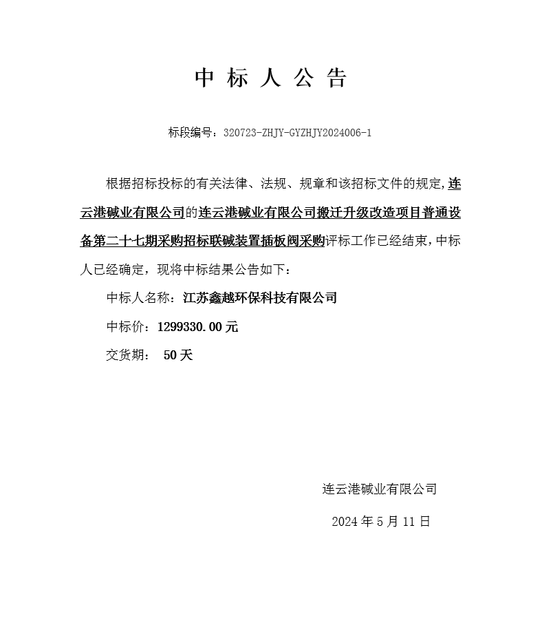 搬遷升級(jí)改造項(xiàng)目普通設(shè)備第二十七期采購招標(biāo)聯(lián)堿裝置插板閥采購中標(biāo)人公告